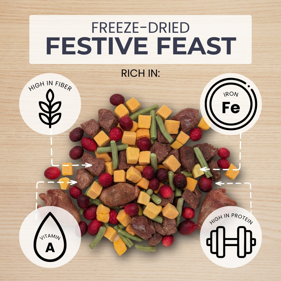 Our Festive Feast Mix is made with 100% human-grade turkey heart, turkey liver, cranberries, green beans and butternut squash, sourced from Canada.