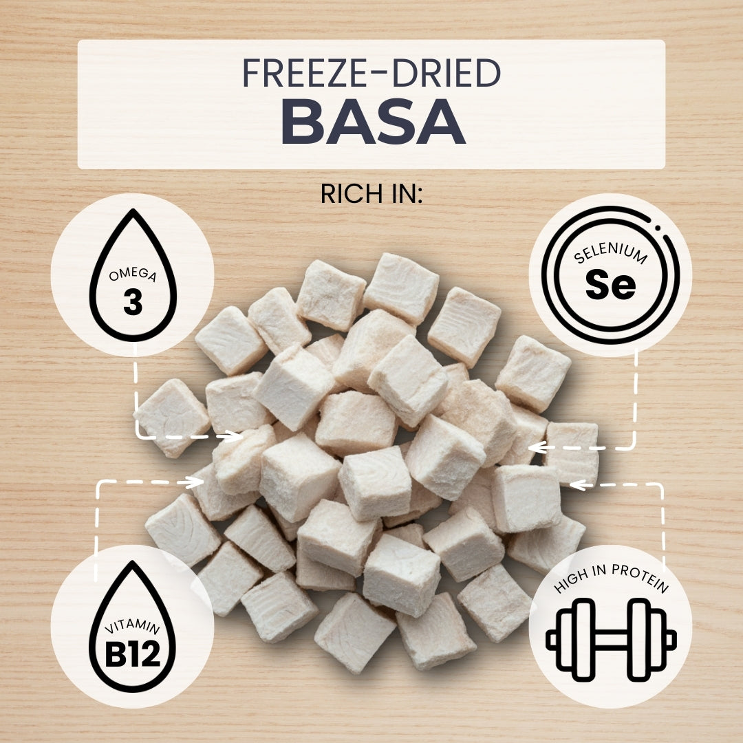 Basa is a low-fat white fish, rich in protein, omega-3s, potassium, phosphorus, and selenium. It promotes healthy skin and coat, supports brain and heart health, and strengthens bones and the immune system.